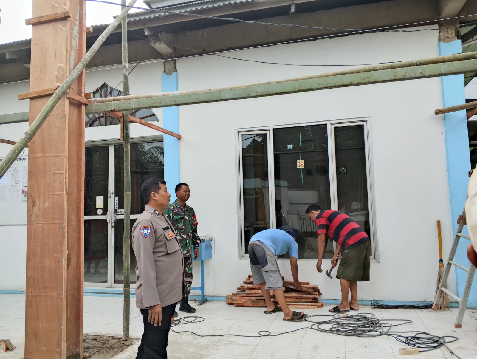 Dalam kegiatan tersebut, Bhabinkamtibmas bersama Babinsa turut membantu proses pembangunan mushola sekaligus menjalin komunikasi yang baik dengan masyarakat melalui penyampaian himbauan kamtibmas.