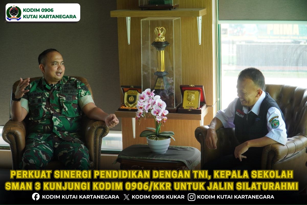 Kutai Kartanegara. patrolihukumindonesia.com- Untuk memperkuat sinergi antara dunia pendidikan dan TNI Kepala sekolah SMAN 3 Unggulan beserta staf lakukan kunjungan silaturahmi ke Kodim 0906/Kkr yang berada di jalan K.H Ahmad Muksin Kelurahan Timbau Kecamatan Tenggarong, Kamis 23/4/26