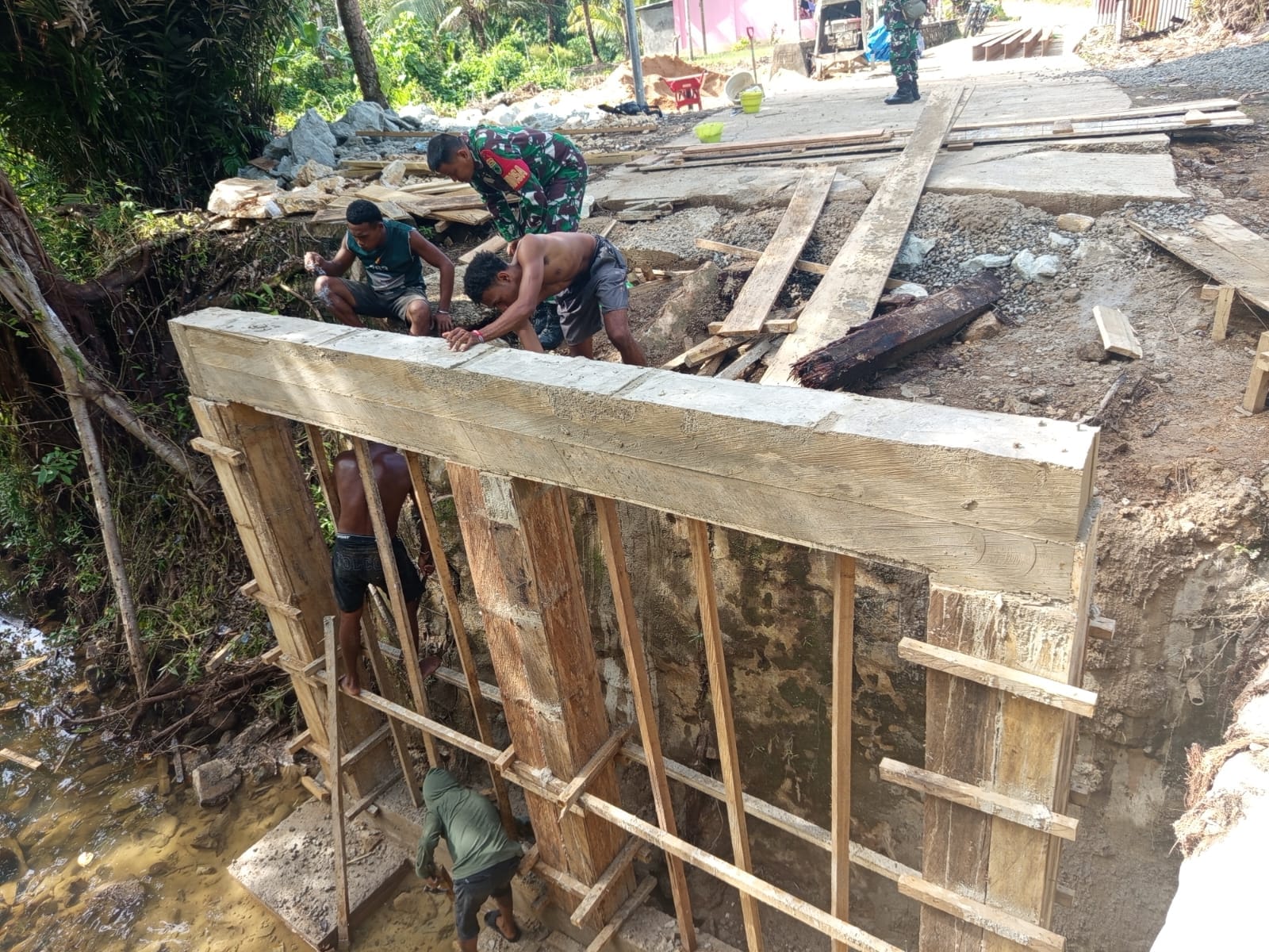 Sorong – Pembangunan Jembatan Garuda Tahap IV Tahun Anggaran 2026 di wilayah Kodim 1802/Sorong terus berjalan sebagai bagian dari upaya meningkatkan konektivitas dan akses masyarakat di Papua Barat Daya ini menjadi salah satu prioritas dalam mendukung kelancaran aktivitas warga, baik dari sisi ekonomi maupun mobilitas sehari-hari. Bertempat di Kampung Klatifi, Distrik Sorong Barat, Kota Sorong. Selasa (14/04/2026)